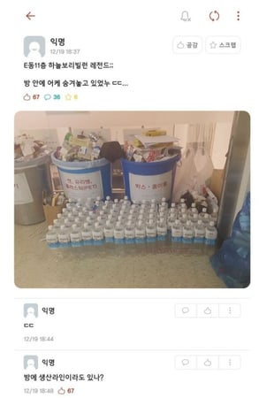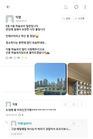 연세대학교 하늘보리 빌런? 은근한 중독성을 가진 보리음료 하늘보리, 최근 연세대에 하늘보리를 잔뜩 마신 괴물이 존재한다고 합니다. 한 사람이 먹었다고 상상하기도 힘든 이 하늘보리에는 어떤 사연이 있을까요?▲ 출처: 연세대 에타매일 마시고 버리는 것이 귀찮아 어느새 인테리어 소품이 됐다는 하늘보리이를 본 누리꾼들은 "룸메 등판이 ㅈㄴ 웃기다" "사이즈 딱 맞는 거 쾌감 오진다" 등의 반응을 보였습니다. 추천 이슈 칸예 웨스트, 내한 후 은퇴 소문? 한국 공연이 마지막 무대?