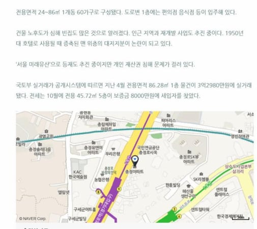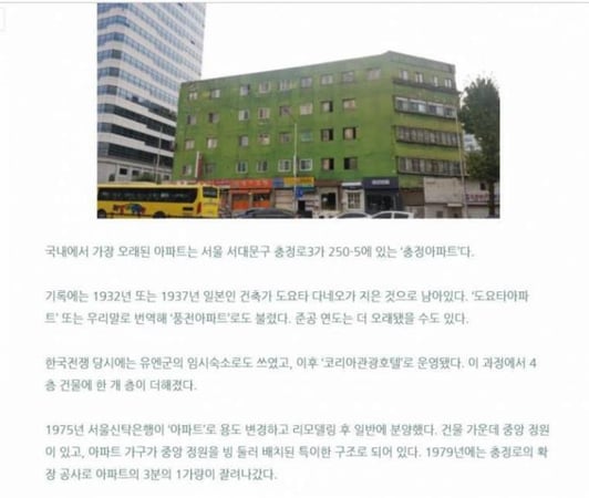 대한민국의 최고령 아파트. 출처: 구글 이미지 검색국내에서 가장 오래된 아파트는 어디일까?서대문구에 위치한 충정아파트이다.충정아파트는 1932년 또는 1937년에 완성된 아파트로 '도요타아파트'라고 불렸다.출처: 커뮤니티 추천 이슈 칸예 웨스트, 내한 후 은퇴 소문? 한국 공연이 마지막 무대?