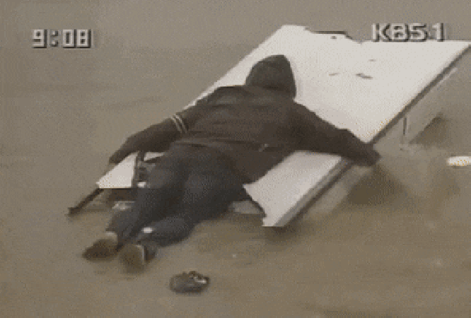 정말 빗물이 모두 역류해 허리까지 오는 빗물을 보트 등에 몸을 맡기고 출근을 하는 서울 사람들... 정말 대단한 시절이었네요.