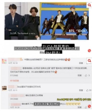 바로 방탄소년단이 중국의 한북공정을 막기 위해서 한복은 한국의 것이라고 공식 석상에서 언급했기 때문입니다. 이를 잇는 중국의 반응이 정말 압권인데요, 지금 BTS의 인기가 중국이 아니었으면 없었음을 중국 정부가 나서서서 주장하며 그런 정치적인 발언을 하지 말라며 화를 낸 것입니다.