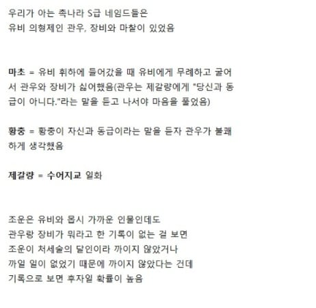 많은 유비와 친한 장수들은 유비의 의형제와 마찰이 잦을 수밖에 없었는데 이상하게 유독 조자룡만 그런 기록이 없다고 합니다.