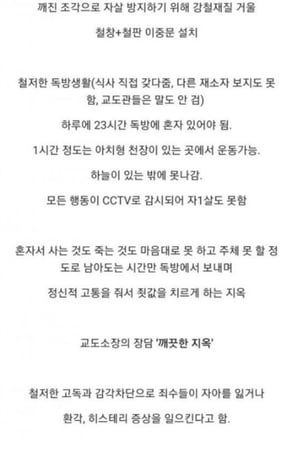 차라리 죽고 싶어지는 감옥.. 위 교도소는 교도소장이 자신하는 깨끗한 지옥이라고 불리는 교도소라고 합니다. 더러운 범죄자들이 모이는 교도소에 깨끗하다는 수식어가 붙으니까 좀 어색하네요. 왜 교도소장은 이곳을 깨끗한 지옥이라고 부를까요?▲ 출처: 온라인 커뮤니티와 하루 23을 독방에서 혼자 말도 못 하고 지내면 정말 미쳐버릴 것 같습니다. 깨끗하다고 하는 이유가 있었네요.이를 본 누리꾼들은 "국내 도입이 시급하다" "난 지금도 말은 안 하고 지내는데" 등의 반응을 보였습니다. 추천 이슈 칸예 웨스트, 내한 후 은퇴 소문? 한국 공연이 마지막 무대?