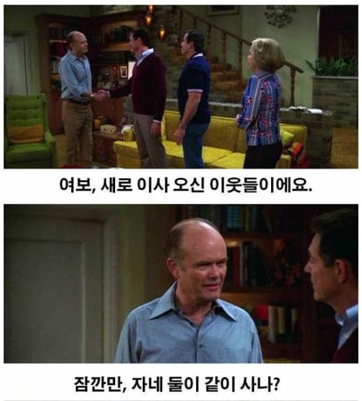 새로 이사온 옆집 커플 우리나라나 외국이나 동성애를 대하는 관점은 모두 비슷합니다. 평범함과는 다른 길을 택했기에 그들에게는 무수한 질타가 쏟아집니다. 위 사진은 최근 티비쇼에 나온 장면으로 남자 둘만 사는 커플을 본 아저씨의 반응이 화제가 되고 있습니다.▲ 출처: 70's show위트있는 아저씨의 발언을 본 누리꾼들은 "결혼은 생각하면 할수록 하기 싫더라" "이게 맞지, 남자 둘이 살면 진짜 천국임" 등의 반응을 보였습니다. 추천 이슈 칸예 웨스트, 내한 후 은퇴 소문? 한국 공연이 마지막 무대?