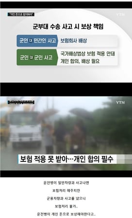 군부대 수송사고 시 보상책임은 군인대 민간인의 사고에서는 보험회사가 배상하지만 군인 대 군인의 사고에서는 국개배상법상 보험 적용이 안돼 개인 합의와 배상이 필요합니다.