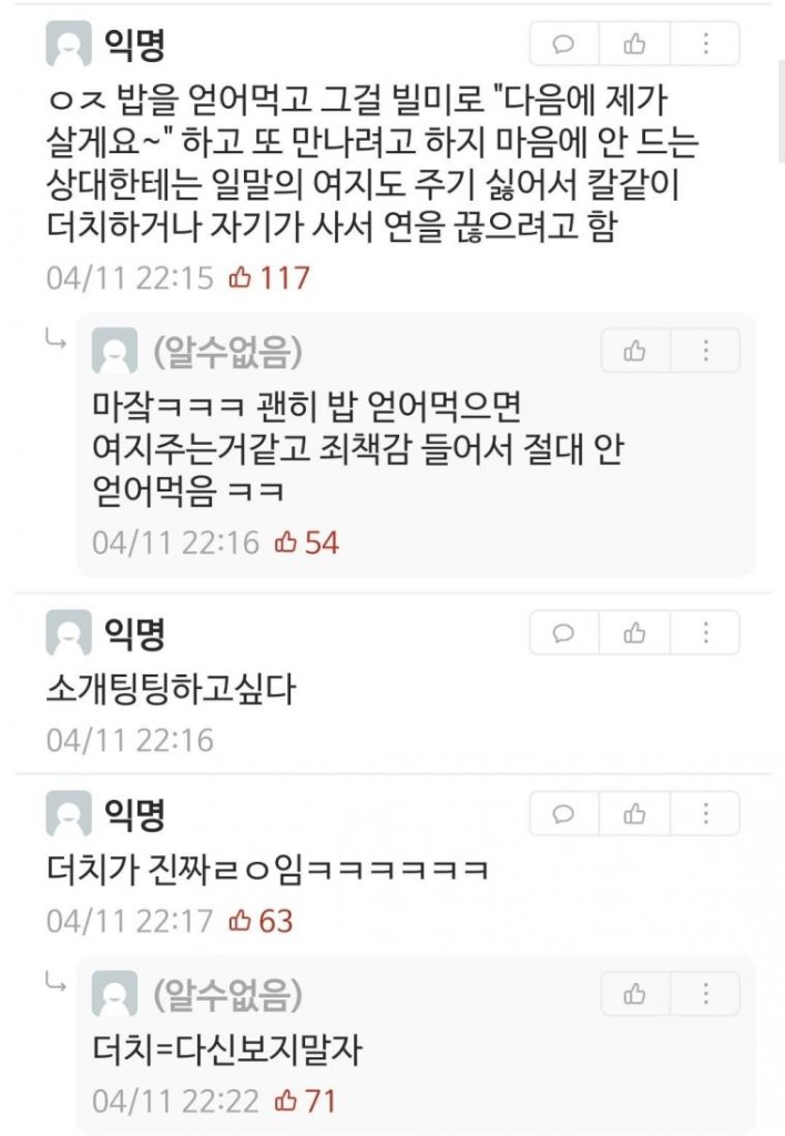 바로 소개팅날 더치를 하면 다시 만날 수 없다고 합니다. 상대방과 아예 미련을 지우기 위해서죠.