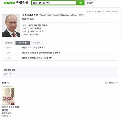 ▲ 출처 : 네이버 인물정보 캡처1952년 10월 7일에 상트페테르부르크에서 태어난 러시아 대통령 블라디미르 블라디미로비치 푸틴의 충격적인 학력이 공개되었다.