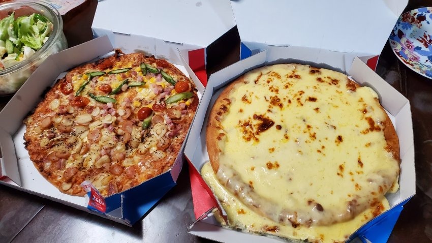 바로 치즈가 너무 많아서 흘러내릴 것 같은 엄청난 양의 치즈를 얹은 피자입니다. 여러분은 어떤 쪽이 좋으세요?