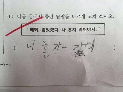 틀렸지만 앞으로 크게 될 녀석 한 초등학생이 틀린 낱말을 바르게 고쳐쓰는 문제에서 따뜻한 마음씨를 나타내 화제가 되고 있다.이 문제는 사실 맞춤법이 틀린 부분을 찾아 고치는 것이다.그런데 이 어린이는 '나 혼자' 먹어야지를 '같이' 먹어야지로 바꿨다.출처: 커뮤니티 캡처 추천 이슈 칸예 웨스트, 내한 후 은퇴 소문? 한국 공연이 마지막 무대?