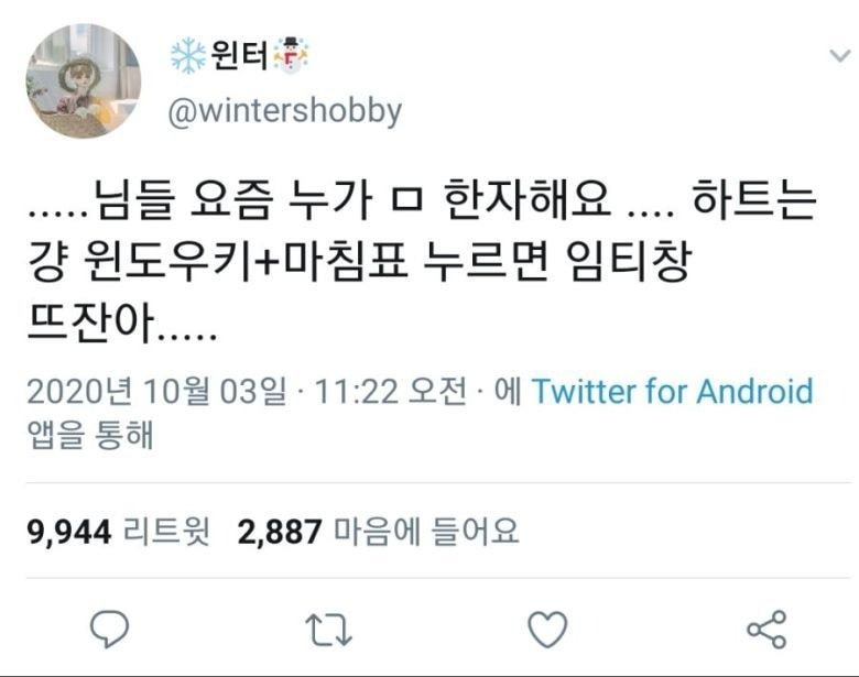 특수문자 입력에도 존재하는 세대차이. 여러분은 컴퓨터 자판에서 이런 특수기호를 입력하는 방법을 아시나요? 컴퓨터 좀 만져봤다고 하는 20대라면 ㅁ+한자 버튼을 사용해 이런 특수문자를 입력할 것입니다. 하지만 요즘 세대는 다른 방법으로 이런 특수문자를 입력한다고 합니다. 과연 어떤 방법일까요?▲ 출처: 온라인 커뮤니티요즘은 ㅁ+한자가 아니라 윈도우 키 + 마침표를 누르면 이모티콘만 따로 모아놓은 창이 뜬다고 합니다. 여러분도 한번 해보세요.이를 본 누리꾼들은 "와 이거 처음 알았다" "철 + 한자 + 9다 이놈들아" 등의 반응을 보였습니다. 추천 이슈 칸예 웨스트, 내한 후 은퇴 소문? 한국 공연이 마지막 무대?