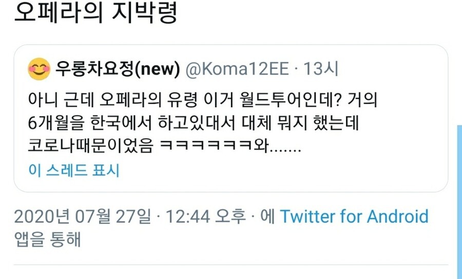 코로나로 인해 한국에서 벗어날 수 없는 것입니다 ㅋㅋㅋ 이제 오페라의 유령이 아니라 지박령이네요.