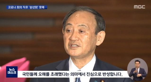 일본 총리가 국민들에게 4명 이하 소규모 회식을 권고하는 기자회견을 끝내고 한 시간 뒤 총리가 단체 송년회에 참석했다가 들킨 것입니다.