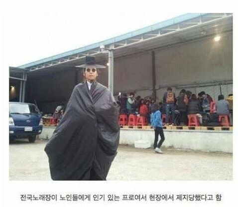 전국노래자랑 레전드 탈락자. 한 인터넷 커뮤니티에서 전국 노래자랑 레전드 탈락자가 이슈이다.해당 게시물에는 저승사자 복장을 한 남성이 서있는 사진이 게시 되었는데 아래 설명에는 "전국 노래자랑이 노인들에게 인기 있는 프로그램이라 현장에서 제지당함" 이라고 설명 되어 있다.이를 본 네티즌들은 "출연자가 잘못했네" "무슨 노래를 준비했을까" 라는 다양한 반응이다.▲ 출처: fmkorea 캡쳐 추천 이슈 칸예 웨스트, 내한 후 은퇴 소문? 한국 공연이 마지막 무대?