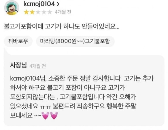 고기불포함 마라탕을 시키고 불고기 포함이라고 했는데 불고기를 주지 않았다며 이의를 제기하는 손님, 이의를 제기할 곳은 자신의 머리가 아닐까요?