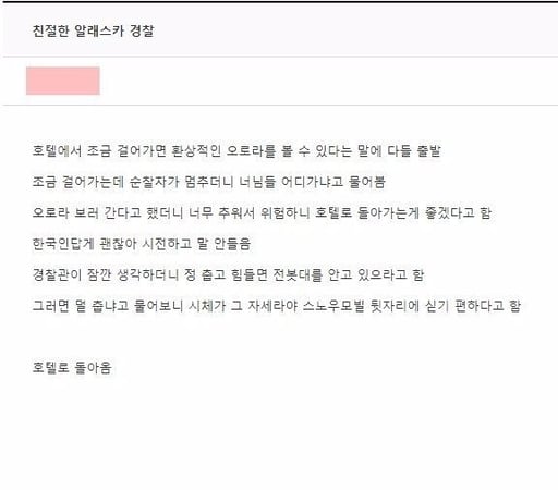 이를 본 누리꾼들은 "경찰 센스" "우리나라가 알래스카보다 춥지않아?" "조금 걸어서 볼 수 있는 오로라면 호텔에서도 보일 것 같은데" 등의 반응을 보였습니다.