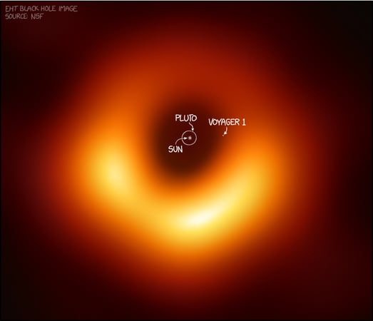 M87 블랙홀과 우리 태양계의 크기 비교 이 크기 비교는 이벤트 호라이즌 망원경으로 촬영한 M87 블랙홀 사진(최초의 블랙홀 이미지)과 그 위에 태양계의 스케일 이미지를 겹쳐 놓은 것이다. 태양, 명왕성(태양에서 가장 먼 행성), 현재 지구에서 가장 멀리 떨어져 있는 심우주 탐사선 보이저 1호를 보여줍니다. 추천 이슈 칸예 웨스트, 내한 후 은퇴 소문? 한국 공연이 마지막 무대?