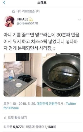 바로 기름이 끓다라는 말에 정신이 팔려 끓지 않는 기름을 끓을 때까지 기다린 것입니다. 기본적으로 요리의 용어나 메커니즘을 잘 모르니 이런 일이 일어나는 것이죠.