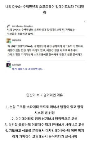 이를 본 누리꾼들은 "맹장은 최근에 존재의 이유가 밝혀졌는데 장내의 유익균을 보관하는 역할을 한다고 하더라, 이외로 필요한 기관임" "내가 못난 이유도 내가 스파게티 코드라서 그런 거지?" 등의 반응을 보였습니다.