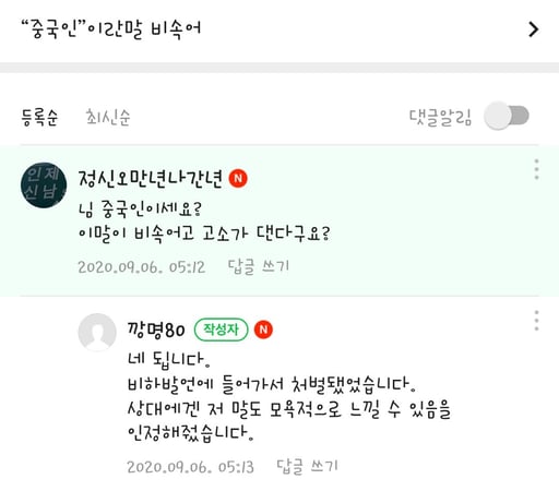 이를 본 누리꾼들은 "됐과 됬을 구분 못 하는 거 보니까 중국인이네" "진짜 중국인은 천안문 사태 때 다 죽어서 없기에 고인 능욕으로 분류됨" 등의 반응을 보였습니다.