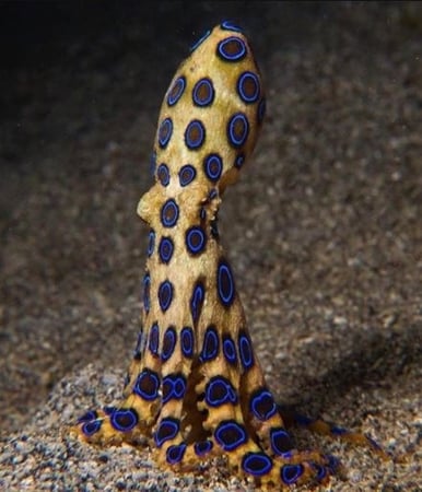 파란 고리 문어류는 10cm 안팎의 작은 크기지만 복어류가 갖고 있는 독(테트로도톡신)을 지닌 맹독 문어이다.