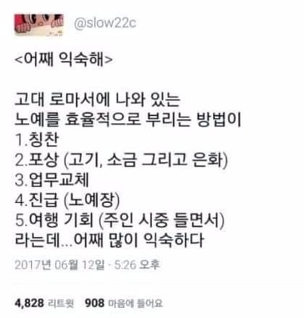 고대 로마의 효율적인 노예 관리법 최근 한 온라인 커뮤니티에 올라온 고대 로마에서 노예를 효율적으로 부리는 방법이 화제가 되고있다. 과연 로마시대의 노예는 어떤 취급을 받은 것일까?▲ 출처: 온라인 커뮤니티칭찬, 포상, 업무교체, 진급, 휴가 등의 복지를 통해 노예의 사기를 고취시켰다고 합니다. 이를 본 누리꾼들은 "내 인생인데?" "회사는 진짜 노예를 부리는 거 였구나" "고대로마는 글로벌 기업이었구나" 등의 반응을 보였습니다. 추천 이슈 칸예 웨스트, 내한 후 은퇴 소문? 한국 공연이 마지막 무대?