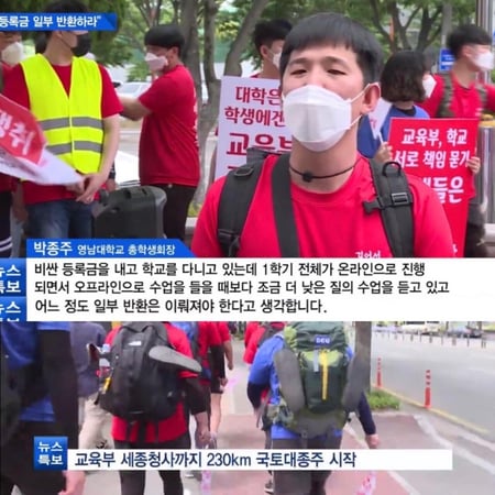 이름값 하는 영남대 학생 회장 특별한 이름 혹은 자신이 지은 개성있는 닉네임처럼 행동하는 사람을 보고 우리는 이름값, 닉값을 한다고 표현합니다.최근 이런 이름값 톡톡히 하는 영남대 학생회장의 사연이 화제가 되고 있습니다.▲ 출처: 뉴스특보비싼 등록금에 비해 낮은 온라인 수업의 질에 항의하려고 국토 대종주를 시작한 학생회작 박종주 이를 본 누리꾼들은 "종주가 종주를 시장하는 거종" "마스크는 썼고?" "결석처리" 등의 반응을 보였습니다. 추천 이슈 칸예 웨스트, 내한 후 은퇴 소문? 한국 공연이 마지막 무대?