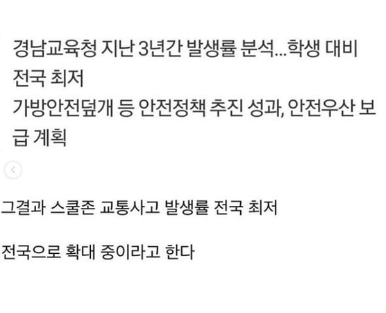 하지만 최근 경남 스쿨존에서 시행되는 독특한 정책이 교통사고 발생률을 전국 최저로 만들어 줘서 화제가 되고있다. 과연 어떤 정책일까?