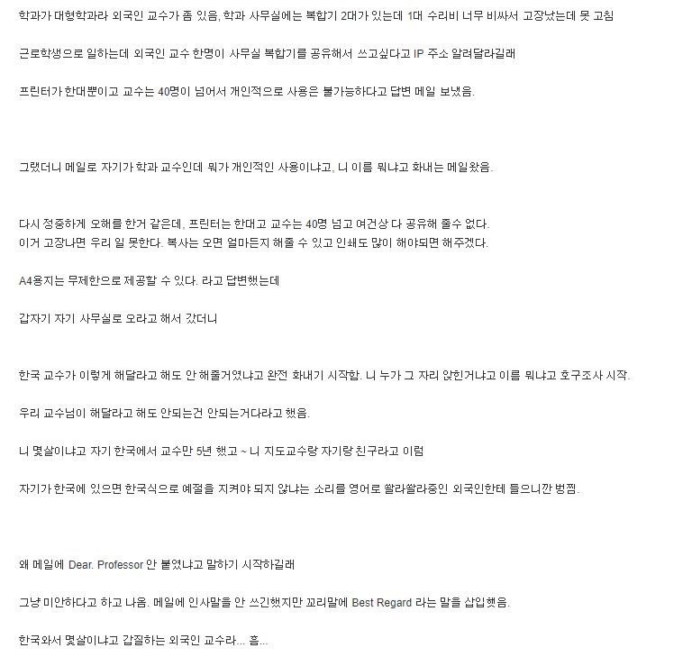 외국인이 한국에 와서 몇살이냐며 교수 신분으로 갑질을 하다니 ㅋㅋㅋㅋㅋ 뭔가 상상이 잘 안가네요.