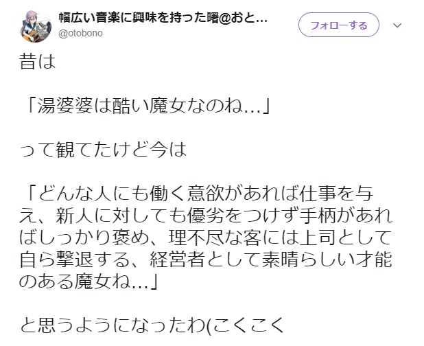 한 일본인은 유바바는 나쁜 마녀라고 생각했지만 어른의 눈으로 보니, 어떤 사람에게도 일할 의욕만 있다면 일을 시켜주고 신입에게도 우열을 따지지 않고 실적이 있다면 확실하게 칭찬하고 진상 손님이 오면 리더로서 직접 격퇴하는 멋진 리더십을 지닌 마녀라는 생각이 들었다고 합니다.