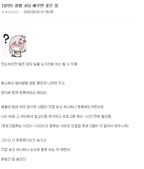 코딩을 할 줄 알면 좋은 점. 컴퓨터와 소통하는 언어를 알고 이를 이용해 프로그램을 만드는 과정을 코딩이라고 합니다. 최근 컴퓨터 언어를 배우는 과인 컴퓨터 공학과를 제외하고 많은 중 고등학생도 간단한 코딩을 많이 배운다고 합니다.이렇게 코딩을 배우면 좋은 점은 뭘까요?▲ 출처: 온라인 커뮤니티간단하게 코딩을 통해 며칠이 걸리는 작업을 1시간 안에 끝내고 잘 놀았다는 누리꾼, 발상이 다르네요 정말ㅋㅋㅋ이를 본 누리꾼들은 "이게 맞다 괜히 빨리 끝내면 다른 일 줌" "역시 자기 능력은 숨겨야지" 등의 반응을 보였습니다. 추천 이슈 칸예 웨스트, 내한 후 은퇴 소문? 한국 공연이 마지막 무대?
