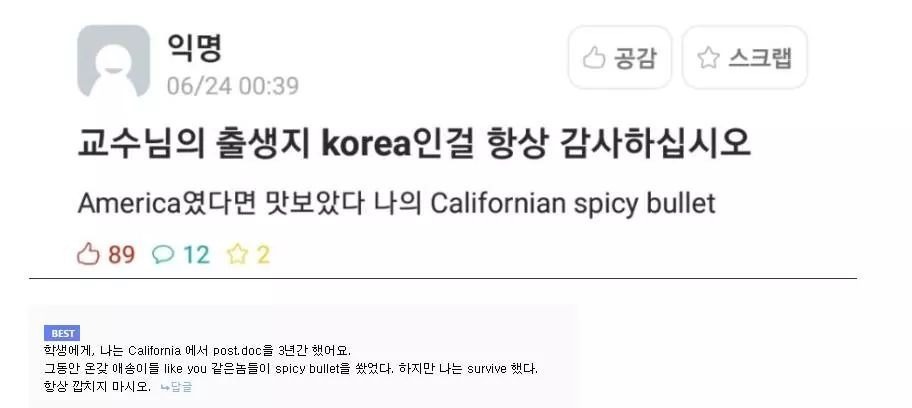 교수님의 출생지가 Korea인 것을 항상 감사하십시오. 기말고사가 다가오면 유독 미워하고 싶은 교수님들, 최근 한 학생이 교수님에게 출생지가 한국인것을 감사하라는 글을 써 화제가 되고 있습니다. 어떤 이유에서 이런 글을 썼을까요?▲ 출처: 온라인 커뮤니티학생들의 무시무시한 경고를 본 누리꾼들은 "ㅋㅋㅋㅋ 티키타가 좋네" " 내 피스톨에는 국경이 없지 조심해라 교수" 등의 반응을 보였습니다. 추천 이슈 칸예 웨스트, 내한 후 은퇴 소문? 한국 공연이 마지막 무대?