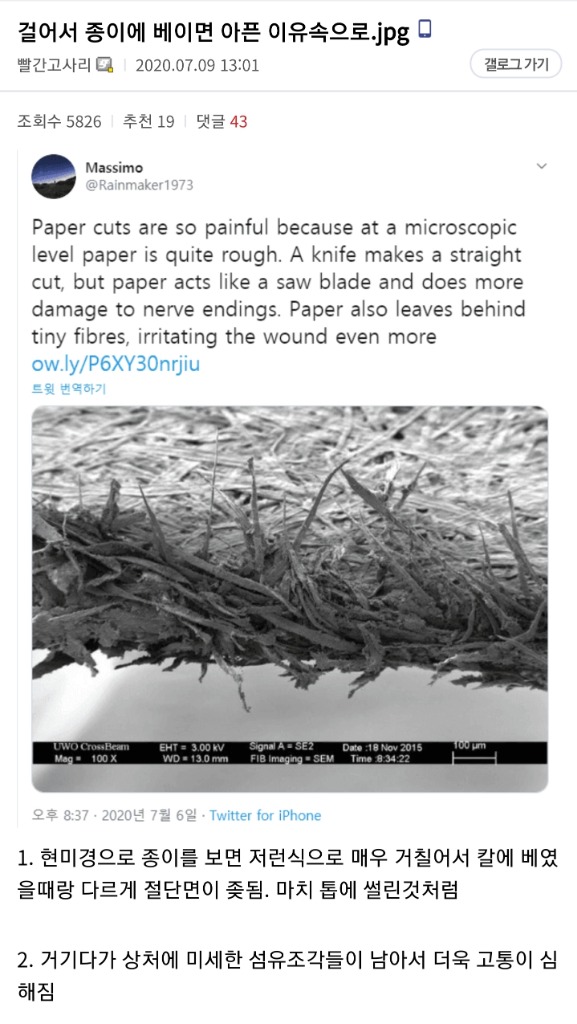 칼보다 종이에 베이는 게 더 아픈 이유 책을 넘기거나 프린트물을 정리하는 등의 행위를 하다 종이에 베이게 되는 일이 있습니다. 이상하게 칼에 베이는 것 보다 종이에 베이는 게 더 따갑고 기분도 나쁩니다. 왜 종이에 베이는 것이 더 따가울까요?▲ 출처: 온라인 커뮤니티종이는 사실 펄프로 만들어졌기에 자세히 보면 칼보다 더 거칠다고 합니다. 이런 미세한 섬유 조각들이 고통을 배가시킨다고 합니다.이를 본 누리꾼들은 아래와 같은 반응을 보였습니다. 추천 이슈 칸예 웨스트, 내한 후 은퇴 소문? 한국 공연이 마지막 무대?