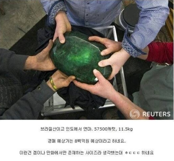 강남 빌딩 한채 값이라는 돌멩이 가격 출처: 픽사베이한 커뮤니티 사이트에 경매 예상가가 무려 '800억'원인 돌멩이가 소개되어 화제가 되고 있다.이 돌의 정체는 11kg짜리 에메랄드였으며 브라질에서 우연히 발견됐다고 한다.출처: 커뮤니티 캡처이 글을 접한 네티즌들은 "맹구가 돌을 줍고 다니는 이유가 있었네 ㄷㄷㄷ""이번 휴가는 브라질이다"와 같은 재치있는 반응을 보였다. 추천 이슈 칸예 웨스트, 내한 후 은퇴 소문? 한국 공연이 마지막 무대?