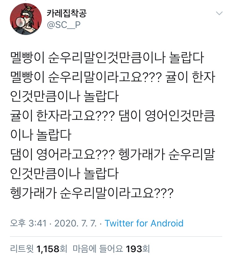 알쏭달쏭한 언어의 세계. 우리가 무심결에 사용하는 언어의 출처를 여러분들은 다 알고 계시나요? 그렇지 못한 예가 바로 시소입니다. 시소는 영어지만 많은 사람들이 이를 잘 모릅니다.그렇다면 우리가 어떤 언어인지 모르고 쓰는 말들이 얼마나 많을까요? 한 누리꾼이 이를 정리한 글이 화제가 되고 있습니다.▲ 출처 : 트위터 카레집착공신기한 언어를 본 누리꾼들은 "목업이 영어인 거 알아? mock-up 실물 모형이라는 뜻으로 사용함" "마세이랑 바리깡이 불어인 게 빠졌네" 등의 반응을 보였습니다. 추천 이슈 칸예 웨스트, 내한 후 은퇴 소문? 한국 공연이 마지막 무대?