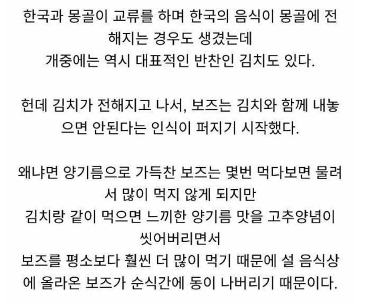 몽골 만두를 김치와 먹으면 안 되는 이유. 위 사진은 몽골의 전통 음식인 양고기 만두 보즈입니다. 최근 우리나라와 몽골의 교류가 활발해져 몽골에도 김치가 전파됐다고 합니다. 최근 이런 김치 때문에 몽골 사람들의 고민이 이만저만이 아니라고 합니다. 왜 그럴까요?▲ 출처: 온라인 커뮤니티보즈와 김치의 조합이 너무 환상적이라 보즈가 남아나질 않는다고 합니다.이를 본 누리꾼들은 아래와 같은 반응을 보였습니다. 추천 이슈 칸예 웨스트, 내한 후 은퇴 소문? 한국 공연이 마지막 무대?