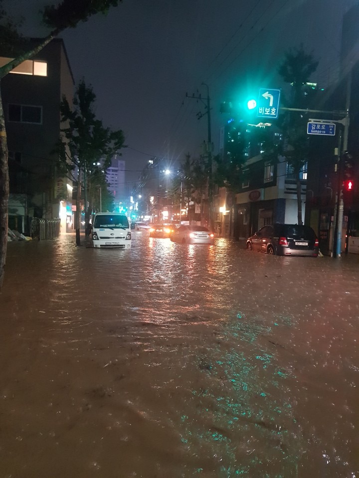 부산 수영에 사는 한 누리꾼의 제보에 의하면 한국도 침수가 시작됐다고 합니다. 이어 누리꾼은 마음만 먹으면 튜브타고 수영강 통해서 해운대까지 갈 수 있다고 전했습니다.