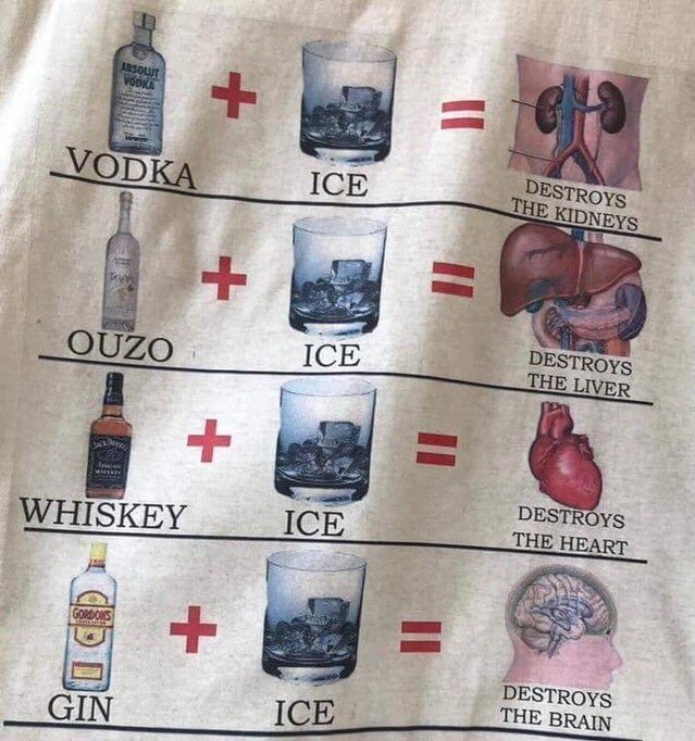 보드카와 얼음을 섞어 마시면 신장을 파괴한다, 우조를 얼음에 타 먹으면 간을 파괴한다, 위스키를 얼음에 타먹으면 심장을 파괴한다, 진을 얼음에 타 먹으면 뇌 기능을 저하시킨다.