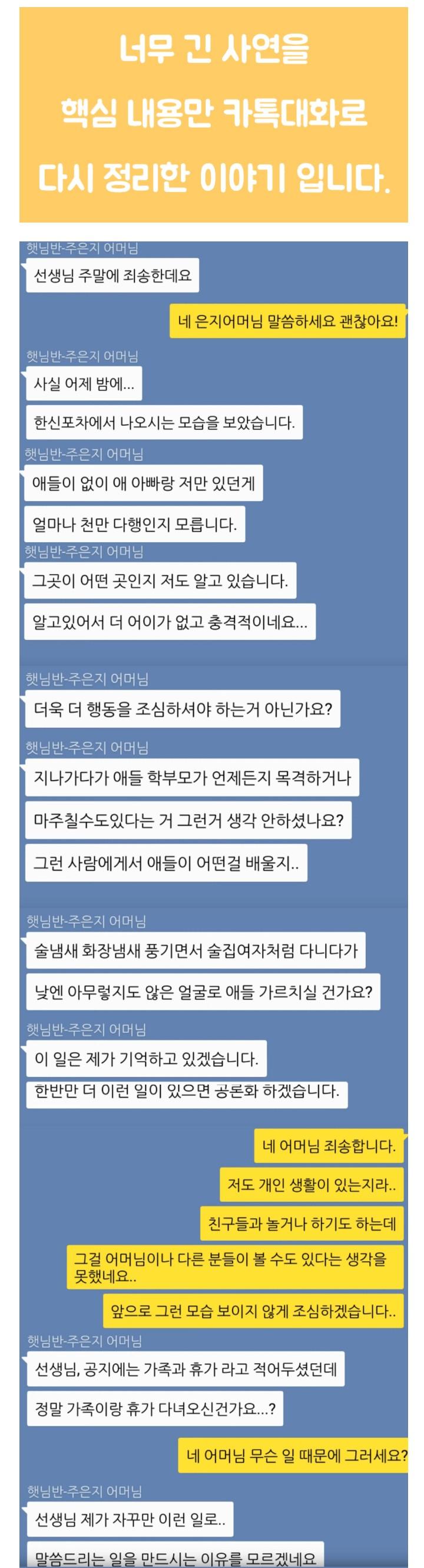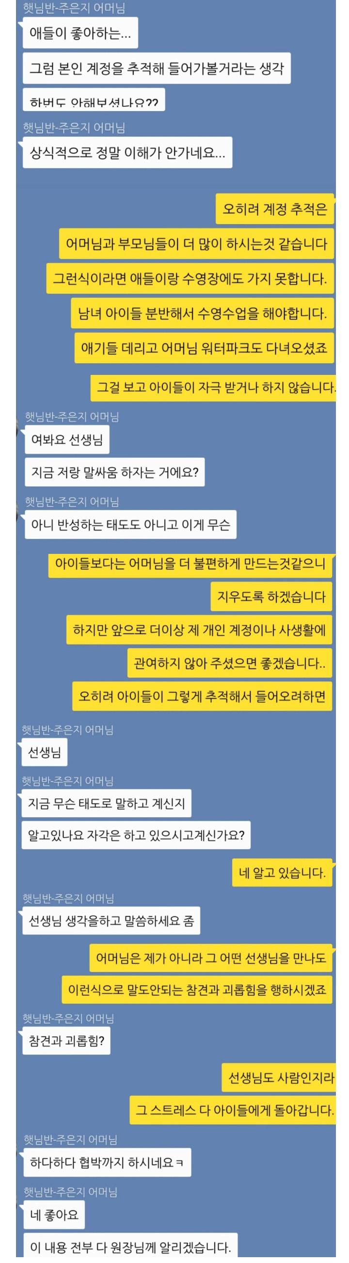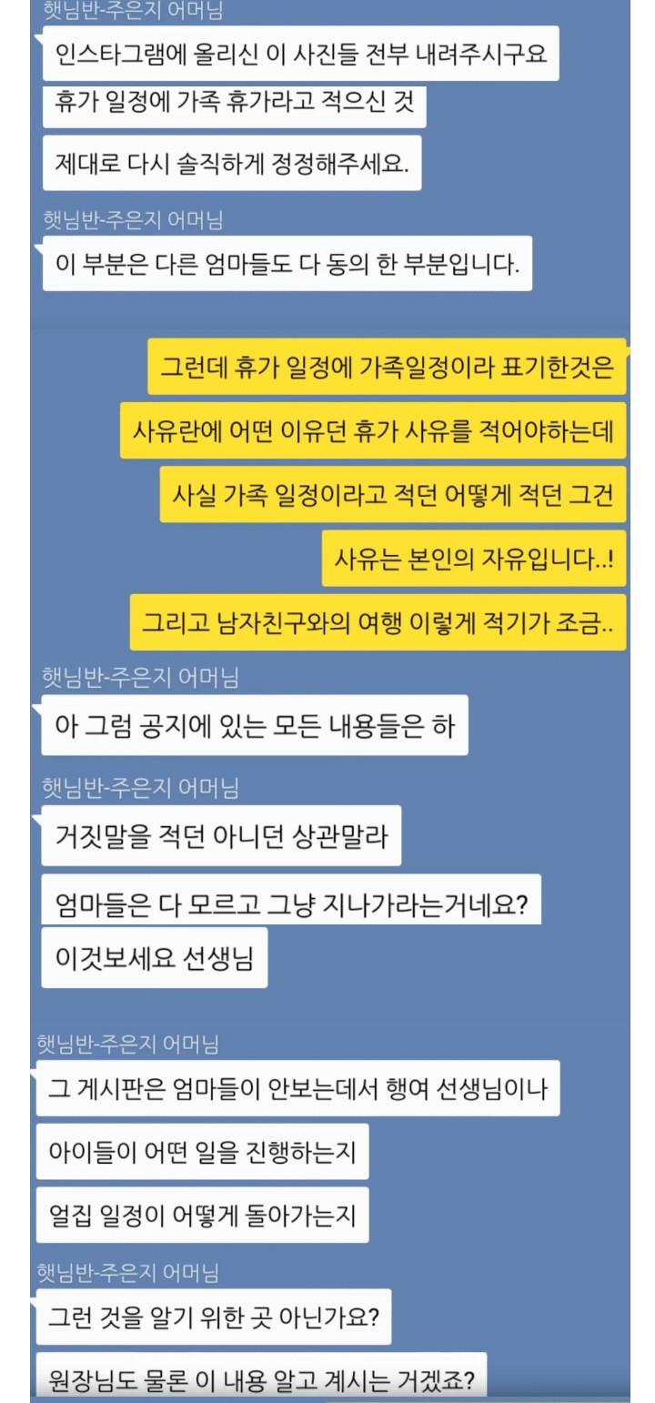 어린이집, 유치원 선생님이 그만두는 이유 한 어린이집 선생님이 학부모에게 받은 카카오톡이 논란이 되고 있다.이 학부모는 휴일은 물론 SNS까지 지나치게 선생님의 사생활에 관여해 많은 이들의 인상을 찌푸리게 했다.도가 지나친 학부모의 간섭에 어린이집이나 유치원 선생님들이 그만두는 이유를 알 것 같다는 반응이 많았다.출처: 인터넷 커뮤니티 캡처 추천 이슈 칸예 웨스트, 내한 후 은퇴 소문? 한국 공연이 마지막 무대?