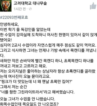 고려대학교에서 성적 올리는 법 대한민국에서 가장 공부를 잘 하는 학생이 가는 학교로 불리는 서울대, 연세대, 고려대 세 대학교. 최근 한 고려대생이 대학 수업에서 성적을 올릴 수 있는 꿀팁을 공개해 화제가 되고 있습니다.▲ 출처: 고려대 대나무숲아... 성적을 올릴 생각이 없었지만 본의아니게 성적이 오른 남학생...이를 본 누리꾼들은 "고려대에서 한 명 제끼는 거 크지" "솔직히 괜찮은 멘트였는데 비쥬얼이 아쉬웠나" 등의 반응을 보였습니다. 추천 이슈 칸예 웨스트, 내한 후 은퇴 소문? 한국 공연이 마지막 무대?