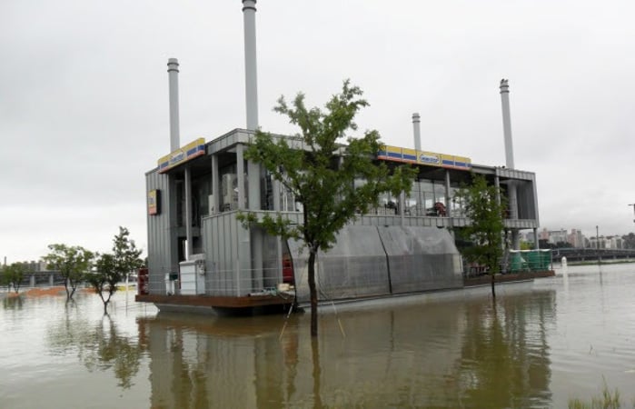 한강이 넘치면 편의점은 그대로 물 위에 뜨다고 합니다. 한강에 위치한 편의점들은 건물이 수위에 따라 위 아래로 움직이는 플로팅 하우스 방식으로 지어져 최대 12m까지 자동으로 떠오른다고 하네요.