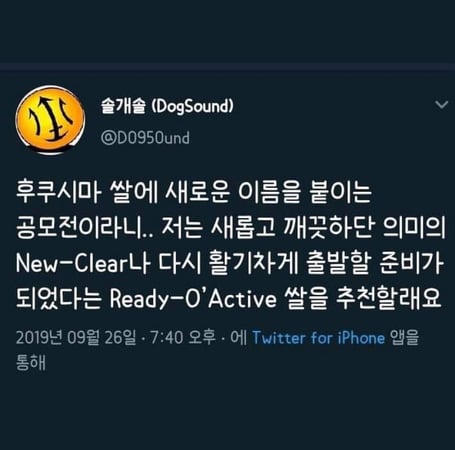 후쿠시마의 쌀 이름 공모전 방사능으로 오염된 땅 후쿠시마, 하지만 일본은 땅과 농산물들이 모두 피폭됐음에도 여전히 후쿠시마에서 쌀 농사를 하고 있다고 합니다.한 술 더 떠 후쿠시마 쌀에 이름을 붙이는 공모전까지 열었다고 하는데요 같이 근황을 알아봅시다.▲ 출처: 트위터이를 본 누리꾼들은 "핵반이나 고이즈 미 어떠세요?" "먹으면 헐크처럼 강해지는 헐크 쌀 어때?" 등의 반응을 보였습니다. 추천 이슈 칸예 웨스트, 내한 후 은퇴 소문? 한국 공연이 마지막 무대?