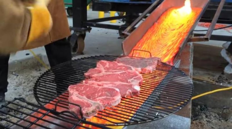 스테이크를 용암에 구워보았다. 출처: 유튜브 'anlemo88' 캡쳐 최근 인터넷 커뮤니티에서 용암으로 스테이크를 굽는 기계가 화제가 되고 있다. 미국의 시러큐스 대학교에서 개발한 인공 용암기계로 영상에서 보는것처럼 그릴 밑에 용암을 깔고 그릴위에는 두툼한 소고기와 연어를 익히기 시작한다. 처음에는 맛있게 익는것처럼 보이더니 이내 용암의 열기로 인하여 불이 붙기 시작한다. 결국 검게 타버리린 고기덩어리를 꺼낼수 밖에 없게 된다. 출처: 유튜브 anlemo88 추천 이슈 칸예 웨스트, 내한 후 은퇴 소문? 한국 공연이 마지막 무대?